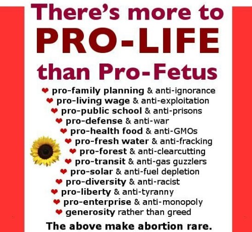 Not that someone can’t be anti-abortion and be a right-to-life or pro-life campaigner too. For example, at least every head of the Catholic Church in my lifetime, going back as far as the 1960s and right up to and including Pope Francis, has taken a strong stance against abortion, and have also taken strong stands against capital punishment and war making, and have been strong advocates for eliminating the causes of poverty and starvation, for protecting water, air and other life-sustain resources on our planet for present and future generations.