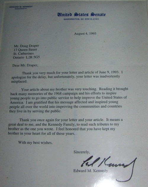 “Your article about my brother was very touching,” Senator Kennedy went on to say in his reply. “Reading it brought back many memories of the 1968 campaign and his efforts to inspire young people to go into public service to help improve the United States of America. I am gratified that this message affected and inspired young people all over the world into improving their communities and countries they live in by serving the public.