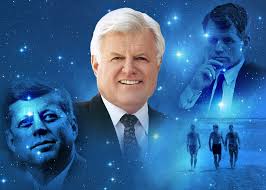 Senator Edward Kennedy with images of his brothers, the late U.S. President John F. Kennedy, assassinated in 1963, to the left, and Bobby Kennedy to the right.