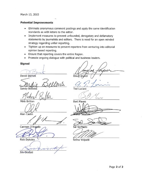 Along with the memo, one of the 13 individuals who signed it – then Niagara Peninsula Conservation Authority (NPCA) CA0 Carmen D’Angelo and now the CAO for Niagara’s regional government – chose to send a letter to Post Media administrators in Toronto, asking for a new management team to be brought in to run The Standard and other then Postmedia newspapers in Niagara (The papers, by the way, have since been bought up by the Torstar media chain.)