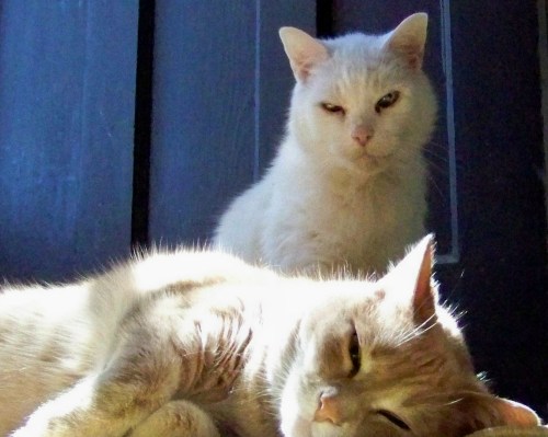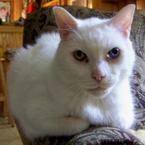 Our fabulous feline friend Dylan – white as snow with one eye green and the other blue – in all his glory.