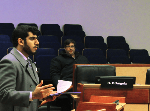 Mo Al Jumaily – at one of numerous Niagara regional council meetings he has attended as a citizen in recent years – speaking out to the council on an issue of public concern. Photo by Emily Beth Spanton