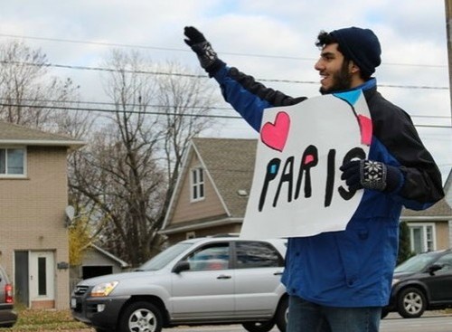 Mo Al Jumaily receiving waves and honks of support in St. Catharines in 2015 while holding up a peace sign for victims of a Paris, France terrorist attack.