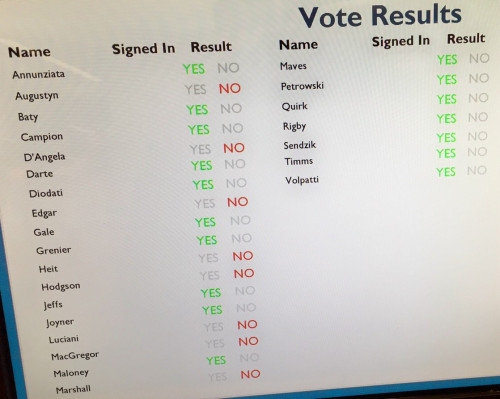Here is information on who on the Niagara regional council voted in October of 2016 to hire Carmen D’Angelo to the position of Niagara Region CAO and who didn’t. Those on the screen below who have ‘Yes’, lit up in green beside their name, voted for D’Angelo.