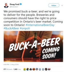 Ontario Premier Doug Ford holds up a cold one following his “buck-a-beer” announcement this past August 7th