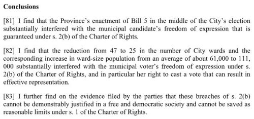The Judge also ruled that the significant reduction in the number of council seats and wards in Toronto, “from an average of about 61,000 (city residents per ward) to 111,000 substantially interfered with the municipal voter’s freedom of expression under … the Charter of Rights.”