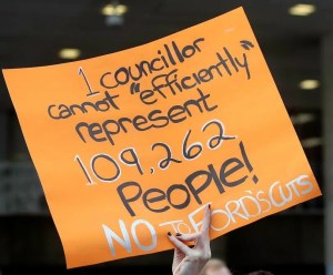 The court ruling specifically states that the provincial government council-cutting action “denies effective representation” to the residents of Toronto because if approved it would mean only one councillor for each 115,000 residents of Toronto.