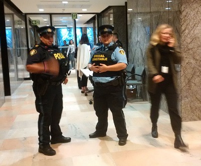 CUTLINE – Security forced all members of the public and health care advocacy groups out of the hallway of a government building that should be open to the public, at the request of the government in an attempt to keep us away from the photo op at which Doug Ford and Health Minister Christine Elliott made their announcement today.