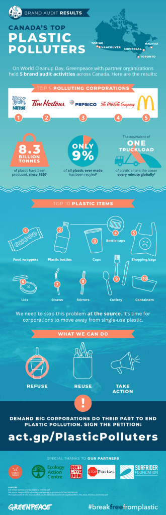 In Canada, top polluting corporations – Nestlé, Tim Hortons, PepsiCo., The Coca-Cola Company and McDonald’s – account for 46% of the 2231 pieces of identifiable branded plastic trash that was collected during the brand audits.