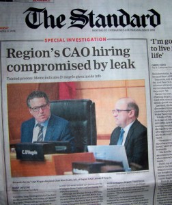 A front page story in The St. Catharines Standard last April, featuring one of many disturbing headlines that coverage of Region’s council generated over the past four years. t.