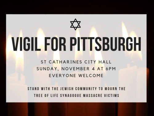 St. Catharines, Ontario – A candlelight vigil to remember the victims of the shooting at the Tree of Life Synagogue in Pittsbburgh will take place in front of St. Catharines City Hall on Sunday, November 4 at 6pm.