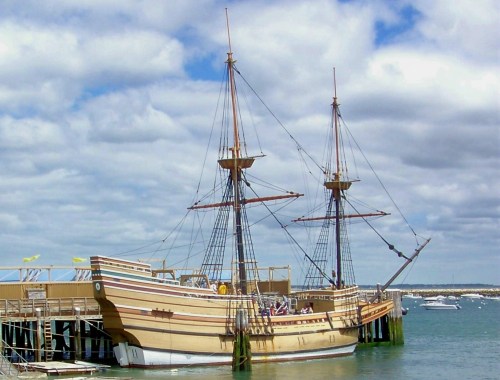 A replica of the Mayflower, the ship that transported the Pilgrims from England to America, 398 years ago in 1620. The Mayflower II, built in England from the original ship designs kept in archives, crossed the Atlantic as a gift to America in the 1950s and is docked in Plymouth Massachusetts where, we are told, the Pilgrims celebrated the first Thanksgiving. Photo by Doug Draper