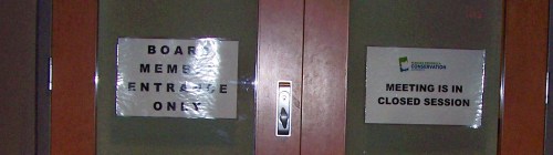 And so it was this January 7th, that after about the first half hour of the first meeting of NPCA’s new board, its members voted to continue with their business in closed session, leaving about 40 or more members of the public out in the hall, on the other side of those papered-over doors.