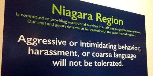 The sign reads; “Aggressive or intimidating behaviour, harassment or coarse language will not be tolerated.”