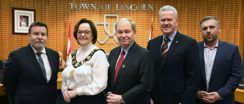 From left to right, Associate Dean Al Unwin, Niagara College; Mayor Sandra Easton; President Dan Patterson, Niagara College; Councillor Paul MacPherson, Town of Lincoln; CAO Michael Kirkopoulos, Town of Lincoln