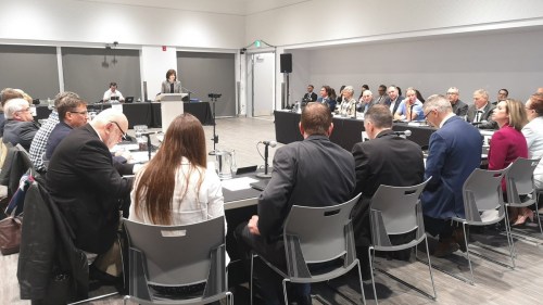 Members of the Niagara Peninsula Conservation Authority’s board and staff listen this May 3rd, as Ontario’s Auditor General, Bonnie Lysyk, stands at the podium at back and outlines the findings and recommendations of her 2018 audit of the NPCA’s operations.