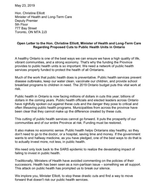To read a CBC story on the letter sent by the former health ministers, click on – https://www.cbc.ca/news/canada/toronto/10-former-ontario-health-ministers-issue-joint-letter-decrying-attack-on-public-health-1.5145835 .