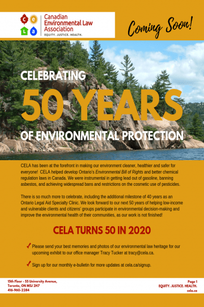 For more information on the Canadian Environmental Law Association and its programs, click on – https://www.cela.ca/ .