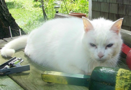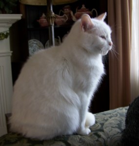 Being as white as he was, he would shine down on the ground like a beacon, and my father, who died a few years ago, would chuckle at this while it looked like Dylan was trying to figure out what happened to the birds he could always see flocking to the feeder when he was inside the house, watching through a window.