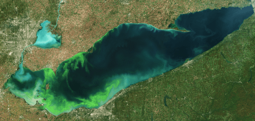 The green algae mass, seen from space as it grows in the western end of Lake Erie, and working its way to the lake’s eastern end off the shores of Buffalo, New York and Niagara, Ontario.