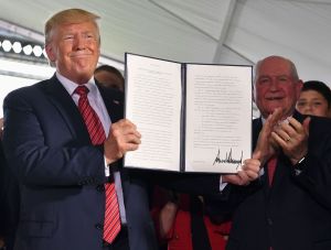Trump mugs for photographers after recently signing an order to log the Tongass National Forest. The old man to the right, clapping and grinning like the prorverbial cat that swallowed the canary, is Sonny Perdue, a former Republican governor for Georgia and vocal climate denier who once sued the U.S. Environmental Protection Agency for rules to make gasoline less polluting. He is now Trump’s Agriculture Secretary.