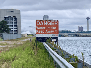 One of the big signs above the Falls, warning boaters not to go any further, Photo courtesy of Niagara Parks