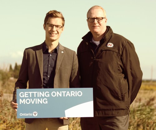 Niagara West MPP Sam Oosterhoff (right) and Peter Van Hezewyk, President and CEO of CAA Niagara, at the QEW in Beamsville