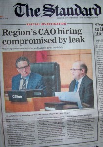 One low point came two years ago when St. Catharines Standard reporter Bill Sawchuk (at right in this photo) had his computer confiscated and was then ordered out of the Niagara regional headquarters during an evening when Al Caslin and the council were in session. An earlier Ombudsman report ruled that the powers-that-be at the Region were wrong to take the computer and throw the reporter out. Photo by Emily Spanton