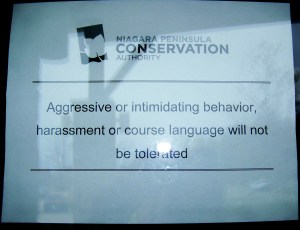 Unwelcome signs like this, aimed at members of the public outside NPCA board meetings, disappeared under the watch of Gayle Wood and the new board