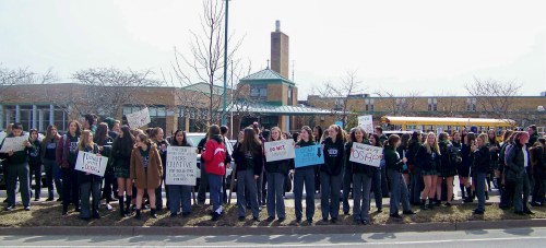 More than 200 students join at Holy Cross Secondary School join in an April 4th, 2019 province-wide walkout to protest cuts the Ford government is making to their education.