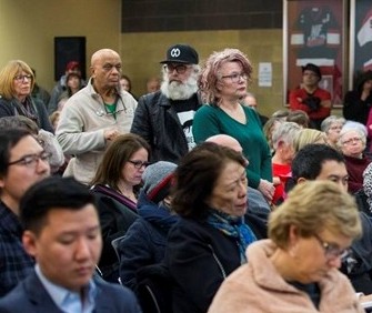 Niagara Falls City Councillor Carolynn Ioannoni, standing centre, right, waiting her turn to speak at a recent public meeting on the controversial Thundering Waters development project.