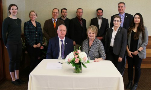 Provost and Vice-President, Brock University, and Sandie Bellows, Niagara Parks Chair, sign the additional collaboration agreement between Brock and Niagara Parks. Garrett Hutson, Associate Professor of Recreation and Leisure Studies, Brock University (left) and David Adames, Niagara Parks CEO (right), look on.