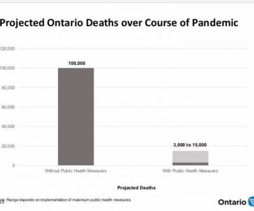 A graph showing the number of COVID-19 deaths Ontario might suffer (roughly 100,000) if no protective measures are taken, versus the number projected if current measures continue.