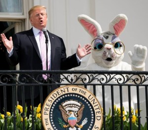 We still don’t know if we will be treated to this ridiculous sight again this year, as seen last year at the annual White House Easter Egg Hunt. Is that his sychophant Mike Pence in the bunny suit? Or is it one of the hosts at Fox News?