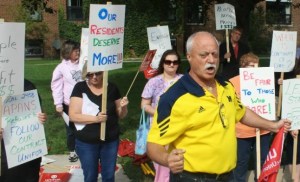 Support workers protest outside a long-term care facility in the Chatham area in late 2018, after Ford government funding cuts resulted in more layoffs and fewer resources needed to care for senior residents