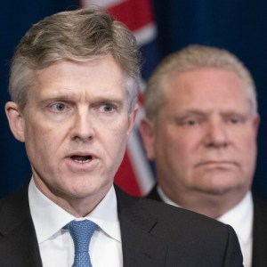 Ontario Finance Minister Rod Phillips at a recent COVID-19 media briefing, with the Premier, Doug Ford, behind him