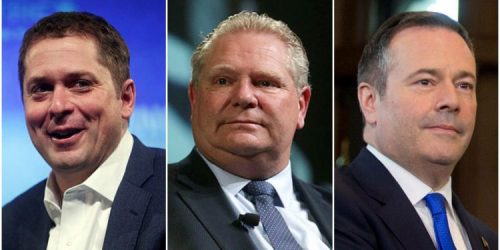Three of Canada’s leading laggards – all Conservatives – from left, federal Tory leader Andrew Scheer, Ontario’s Doug Ford and Alberta’s Jason Kenney