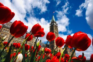 Each spring, hundreds of thousands of tulips bloom on the grounds on and around Parliament Hill in Ottawa, Canada. The Dutch royal family presented tulip bulbs as a gift to Canada following the liberation of the Netherlands by Canadian troops in 1945.