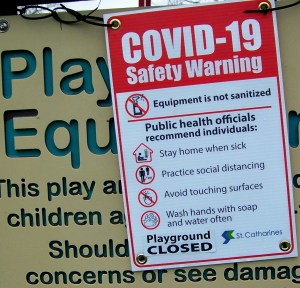 A stark sign of our times at a children’s playground at a park in St. Catharines, Niagara. For the sake of public safety, signs like this probably won’t be taken down any time soon.