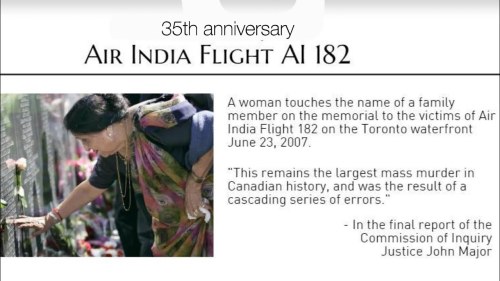 “Thirty-five years ago today, an explosion on Air India Flight 182, bound for the United Kingdom from Canada, killed the 329 innocent people on board, including 280 Canadians.