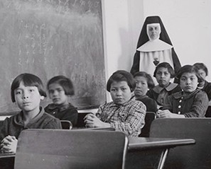 Aboriginal girls in one of Canada’s many residential schools, here in the 1940s, where government authorities were allowed to literally abduct children from their families and imprison them in these institutions for the purpose of “taking the Indian out of the child.” The residential school system began under Canada’s first Prime Minister John A. Macdonald, and continued into well into the last half of the 20th century.