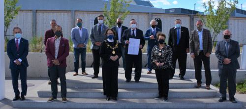 Niagara mayors and Niagara Regional Chair Jim Bradley at a recent signing ceremony. The only one not wearing a mask in the phto is West Lincoln Mayor Dave Bylsma, second from left at the back. Photo courtesy of Niagara Region with, thrid from left in front row, Dr. Liette Vasseur, President, Canadian Commission for UNESCO. Photo courtesy of Niagara Regi