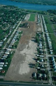 A historic aireal shot of the Love Canal neighbourhood, with the dump of poisons in the middle, and the Niagara River, where the chemical poisons were also leaking to, in the background.