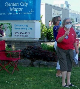Sue Hotte, a remember of the Ontario Health Coalition and leader of its local grouup, the Niagara Health Coalition, calls out for more help for seniors and staff in Ontario’s long-term care homes, at a news conference last summer in St. Catharines. Photo by Doug Draper