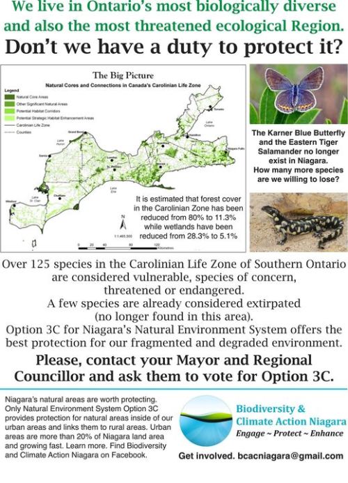 This message produced by the Biodiversity and Climate Action  Niagara, a large coalition of individuals and citizen groups advocating for natural heritage across our Niagara region.