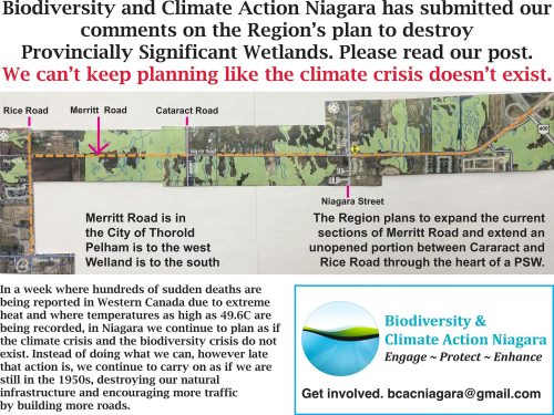 The undersigned groups and citizens from around Niagara are writing to state our emphatic opposition to the Region’s plan to expand the existing sections of Merritt Road which will destroy adjacent wetlands, and to the plan to extend Merritt Road between Cataract Road and Rice Road right through the middle of a Provincially Significant Wetland which, again, will utterly destroy it.