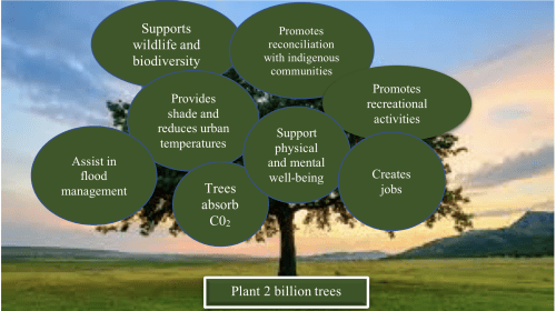 About 2 Billion Trees – The 2 Billion Trees program is committed to partnering with governments and organizations to plant two billion trees – trees that will capture and store carbon from the atmosphere, improve air and water quality, help to restore nature and biodiversity, cool our urban centres and create and support thousands of green jobs.