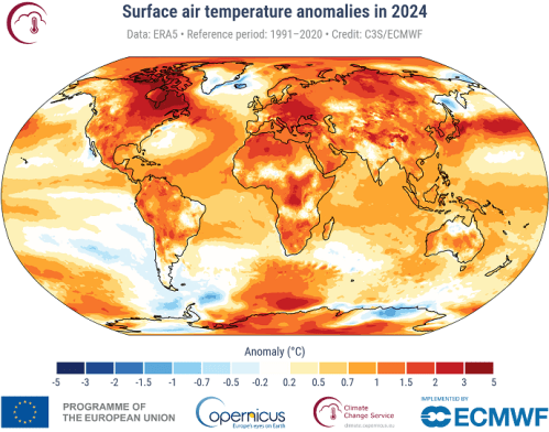 Surface air temperature anomalies for 2024 relative to the average for the 1991–2020 reference period. Data: ERA5. Credit: C3S / ECMWF.