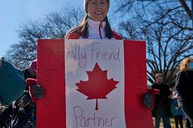 One of our American neighbours holding a poster of a Canadian flag bearing the words; “Ally, Friend, Partner.”