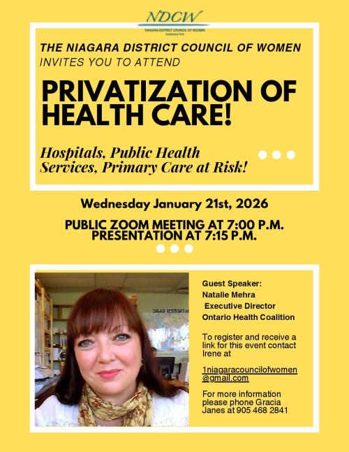 On Wednesday January 21st at 7:00 p.m. , the Niagara District Council of Women is holding a public zoom meeting regarding the Provincial Government’s Privatization of Health Care and its impact on hospitals, public health services and primary care in Niagara, Ontario and elsewhere in Canada.